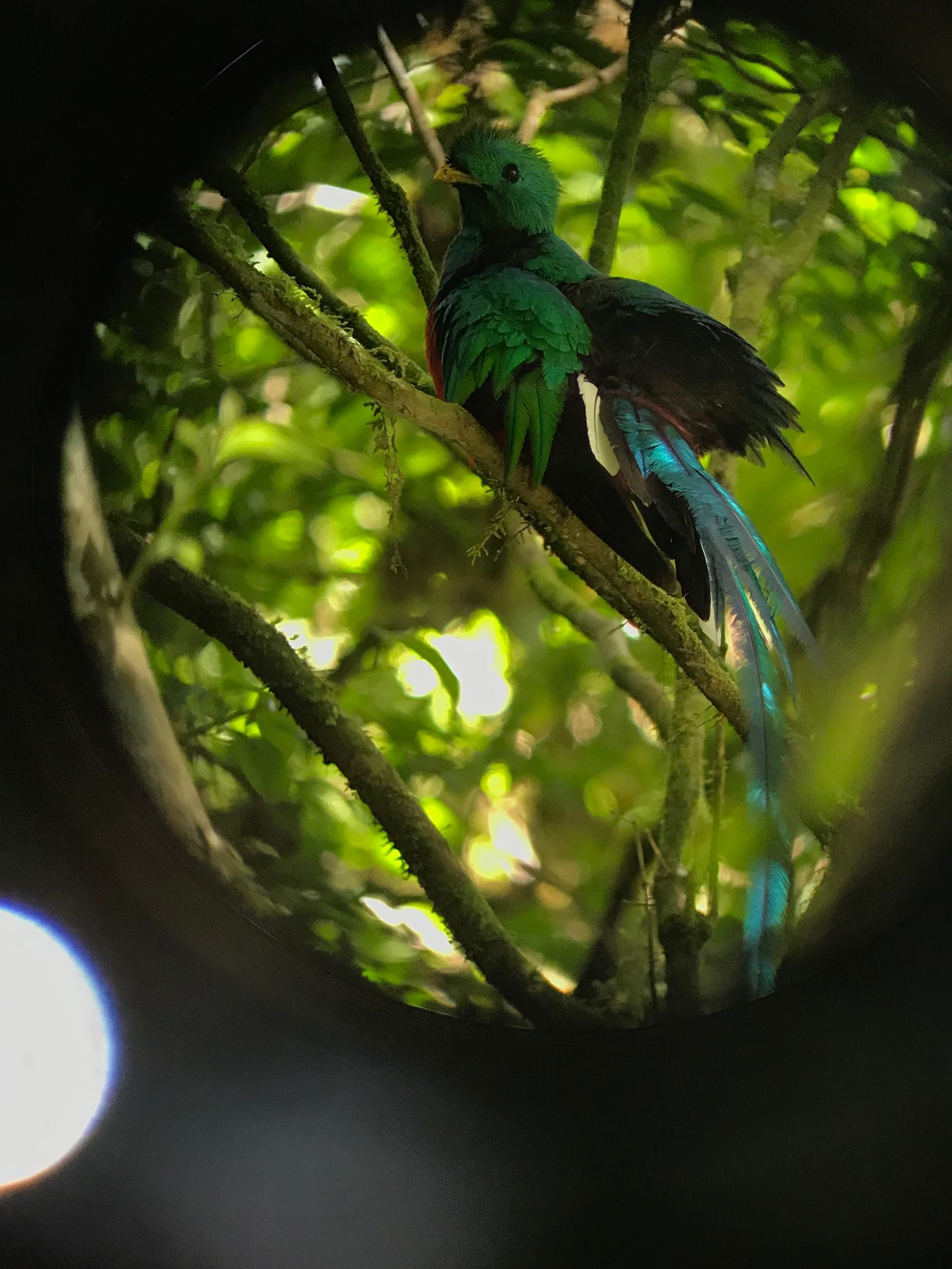 The bird which took shape was a Resplendent Quetzal (Pharomachrus mocinno), a medium-sized bird resplendent in brilliant green feathers, a bright red breast, with a swirling wispy tail longer than the length of its body. Evidently, this sort of bird is a rare sight in the Monteverde mountains of Costa Rica and I relished the somewhat blurry sight of this bird by taking a picture with my phone through the sight of the telescope.